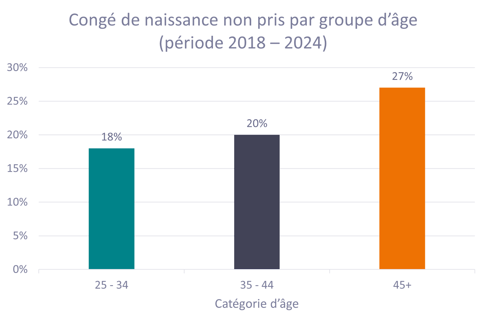 L’âge joue également un rôle. Près d’un tiers (27%) des pères et coparentes de plus de 45 ans ne prennent pas l’intégralité des jours de congé de naissance auxquels ils ont droit. Chez les 25 - 34 ans, ce chiffre s’élève à peine à 18%.