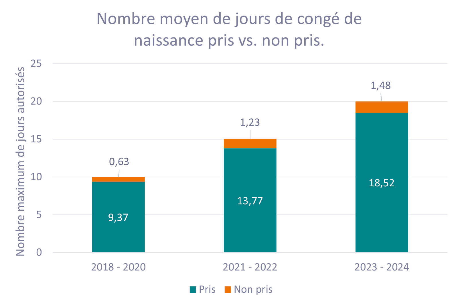 À partir de 2021, lors de l’allongement du congé de naissance à quinze jours, le pourcentage de pères et de coparentes qui y ont renoncé est passé à 22%. Même après l’allongement du congé de naissance à vingt jours, en 2023, plus d’un cinquième des pères et des coparentes (21,5%) n’ont pas pu ou n’ont pas voulu le prendre dans son intégralité.